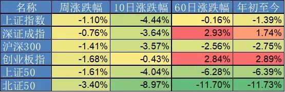上周上证指数下跌1.10%,深证成指下跌0.76%,创业板指下跌1.68%。成交量方面,市场共成交10.56万亿元。分行业看,基础化工、有色金属、综合板块涨幅居前;非银金融、计算机、农林牧渔板块跌幅居前。