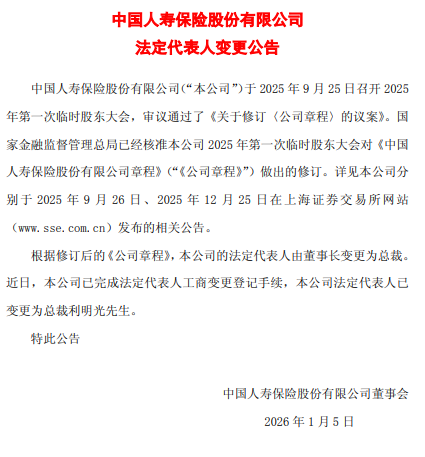 中国人寿保险表示,根据修订后的《公司章程》,公司的法定代表人由董事长变更为总裁。近日,公司已完成法定代表人工商变更登记手续,公司法定代表人已变更为总裁利明光。
